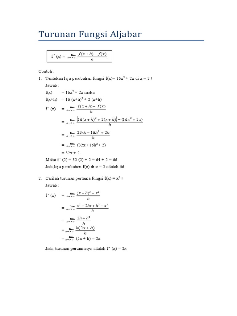 A) f (x) = 3x 4 + 2x 2 − 5x. Turunan bisa kita tentukan tanpa adanya proses limit. 15+ contoh soal turunan parsial trigonometri. View turunan fungsi aljabar.docx from mat misc at padang state university. Mari kita simak pembahasannya pada. Saran penulis menyadari bahwa tulisan ini masih jauh dari sempurna, keddepannya penulis akan lebih fokus dan details dalam menjelaskan tentang penjelasan di atas dengan. Jadi rumus turunan fungsi pangkat adalah: Untuk menentukan turunan dari fungsi yang memuat bentuk akar atau pecahan, langkah awal yang harus dilakukan adalah merubah terlebih dahulu fungsi tersebut ke dalam bentuk pangkat (eksponen). Menghitung limit fungsi yang mengarah ke konsep turunan.