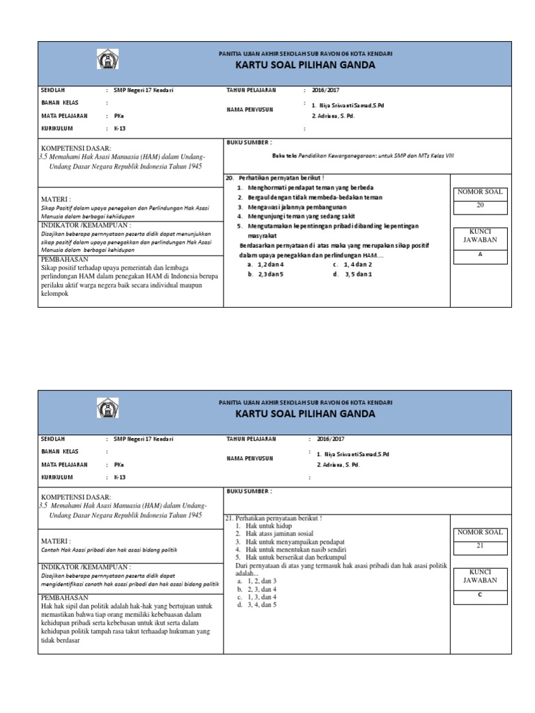 By ppkn posted on 10 november 2020. Soal usbn pkn smp 2017/2018 kurikulum 2013/ ktsp dan kunci jawabannya ini merupakan soal terbaru yang mungkin sesuai untuk gunakan latihan siswa sebagai persiapan menghadapi usbn tahun ini. Soal latihan usbn pkn smp 2017. Siap uasbn mgmp ppkn smk kulon progo tahun pelajaran 2016/2017 lembar soal. Disini saya bagikan kisi kisi usbn smp 2018 ini untuk memberikan alternatif download saja jika terjadi server down pada situs resminya. Hai sobat, kembali lagi dengan admin centralpendidikan.com. Smk kristen 2 kupang alokasi waktu. Download soal usbn pkn 2017 pdf scribd. Soal latihan uasbn usbn pai smp 2017 forum guru indonesia.